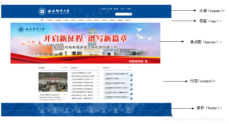 根据上面西安邮电大学官网图可以看到,我们的页面布局主要由头部(header)、导航(nav)、焦点图(banner)、内容(content)、页面底部(footer)五部分组成。