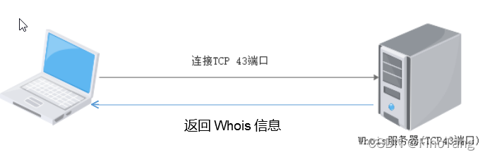 WHOIS协议。其基本内容是,先向服务器的TCP端口43建立一个连接,发送查询关键字并加上回车换行,然后接收服务器的查询结果。