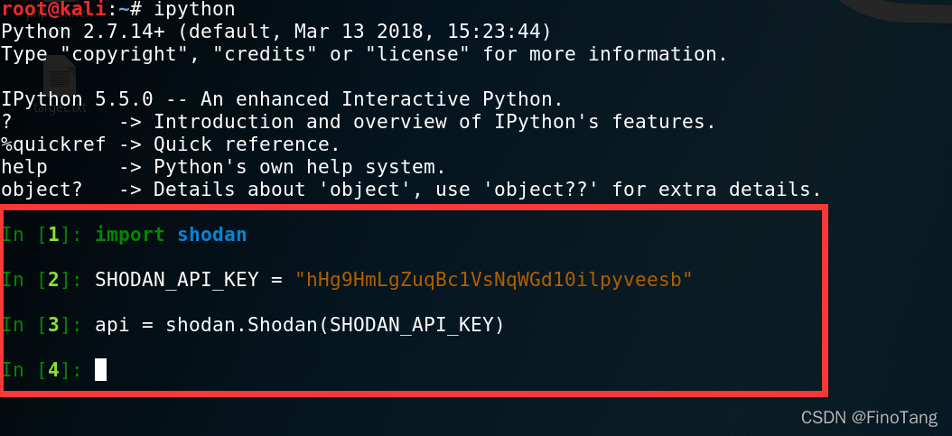 初始化Shodan就是给Shodan初始化API Key。API Key: hHg9HmLgZuqBc1VsNqWGd10ilpyveesb