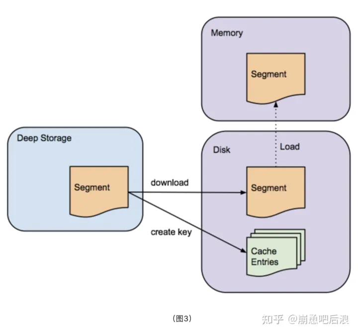 如图3,在历史节点从深存储区下载某一segment之前,它会先检查本 地缓存信息中看segment是否已经存在于节点中,如果segment还不存在缓存中,历史节点会从深存储区下载segment到本地。这阶段处理完 成,这个segment就会在Zookeeper中进行通告。此时,这个segment就可以被查询了,查询之前需要将segment加载到内存中。