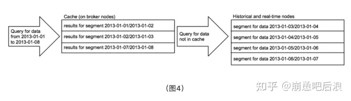 如图4,每次Broker节点接收到查询请求时,都会先将查询映射到一组 segment中去。这一组确定的segment的结果可能已经存在于缓存中,而不需要重新计算。对于那些不存在于缓存的结果,Broker节点会将查询 转发到正确的历史节点和实时节点中去,一旦历史节点返回结果,Broker节点会将这些结果缓存起来以供以后使用,这个过程如图6所示。实时数据永远不会 被缓存,因此查询实时节点的数据的查询请求总是会被转发到实时节点上去。实时数据是不断变化的,因此缓存实时数据是不可靠的。