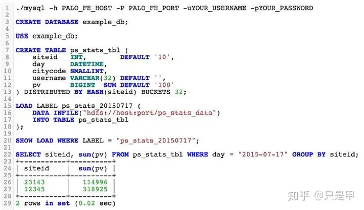 Doris 的使用方式和 MySQL 类似,创建 database,创建 table,导入数据、执行查询等。具体详见下图: