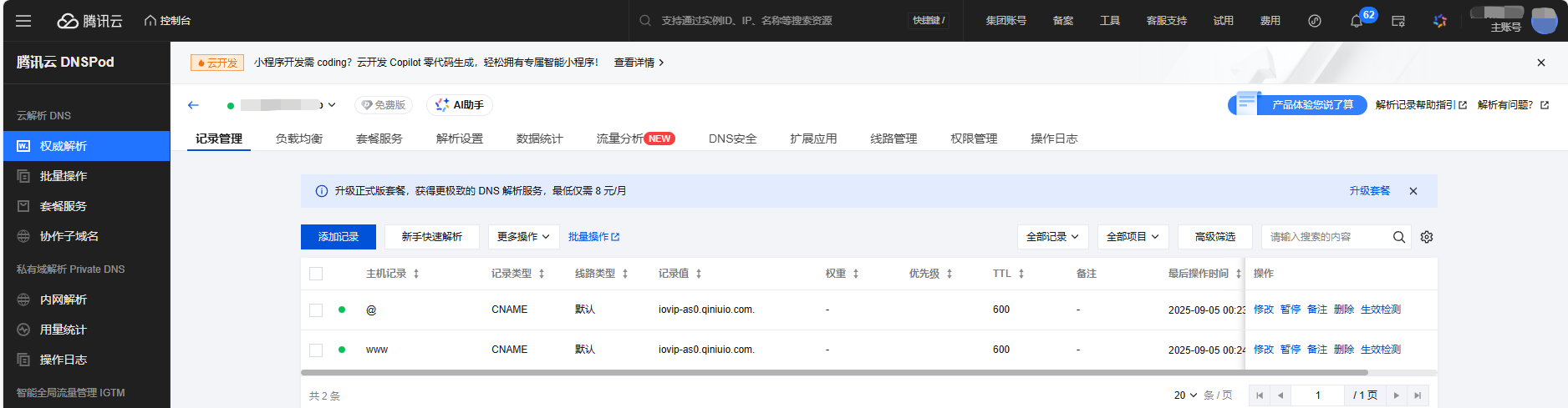 在腾讯云的域名管理,配置域名映射,即这里的添加记录管理,如图所示。