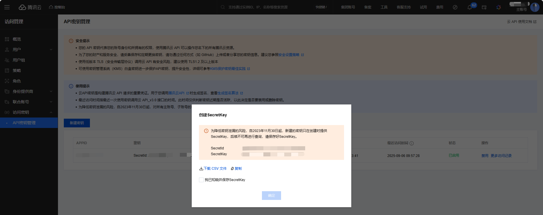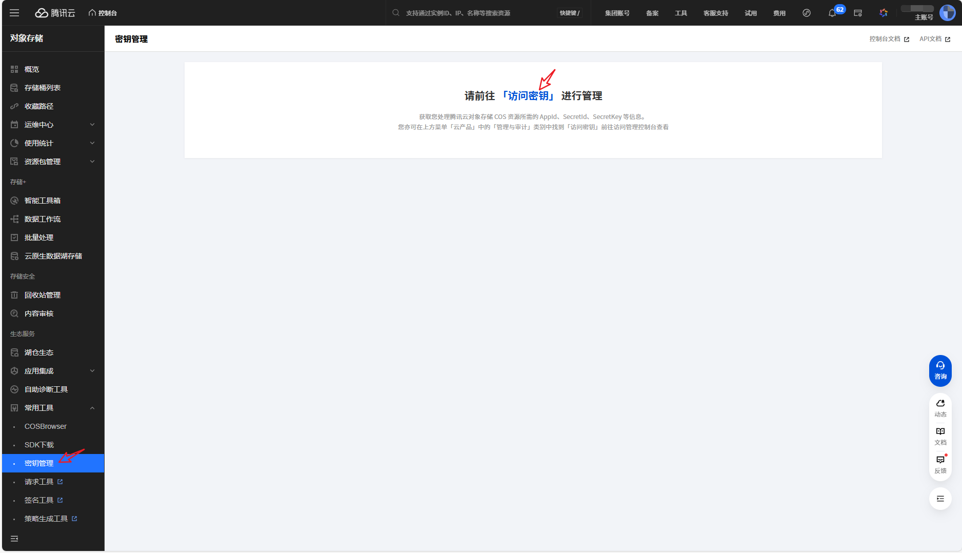 - 获取密钥信息:进入对象存储,点击【密钥管理】,点击【访问密钥】