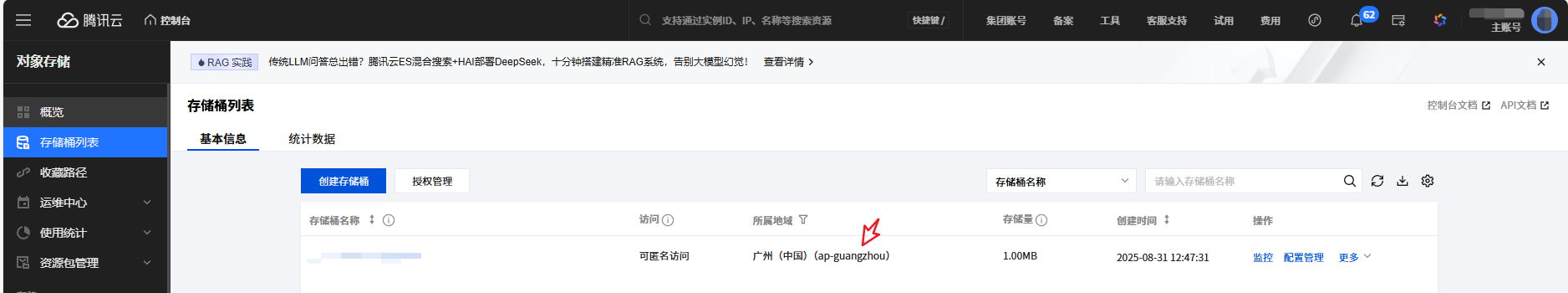 设定 Bucket 即配置桶名;设定存储区域即前置步骤中的存储区域信息中的所属地域。