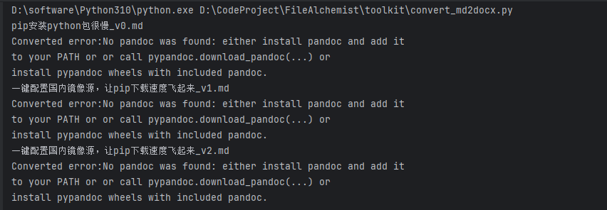 这个错误的意思是:系统找不到pandoc程序。pypandoc本身只是一个Python接口,真正负责转换工作的是pandoc这个底层工具。如果没有安装pandoc,或者没有正确配置环境变量,就会报这个错。