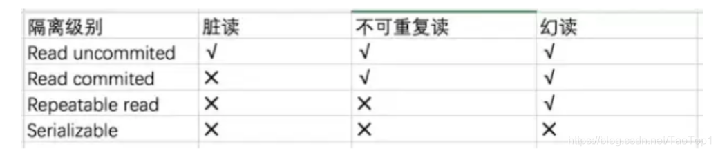 四种隔离级别:Read Uncommitted(读取未提交内容),Read Committed(读取提交内容),Repeatable Read(可重读),Serializable(可串行化)
