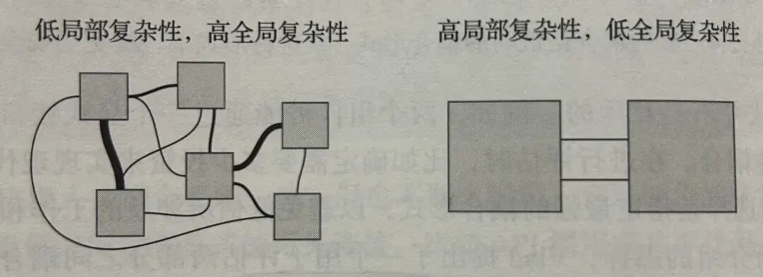 反之,我们可以把很多领域和逻辑,放在一个大系统中,这样系统和服务就变少了,系统间交互变得简单,但是系统内又会是一团乱麻。造成了“高局部复杂性,低全局复杂性”的局面。
