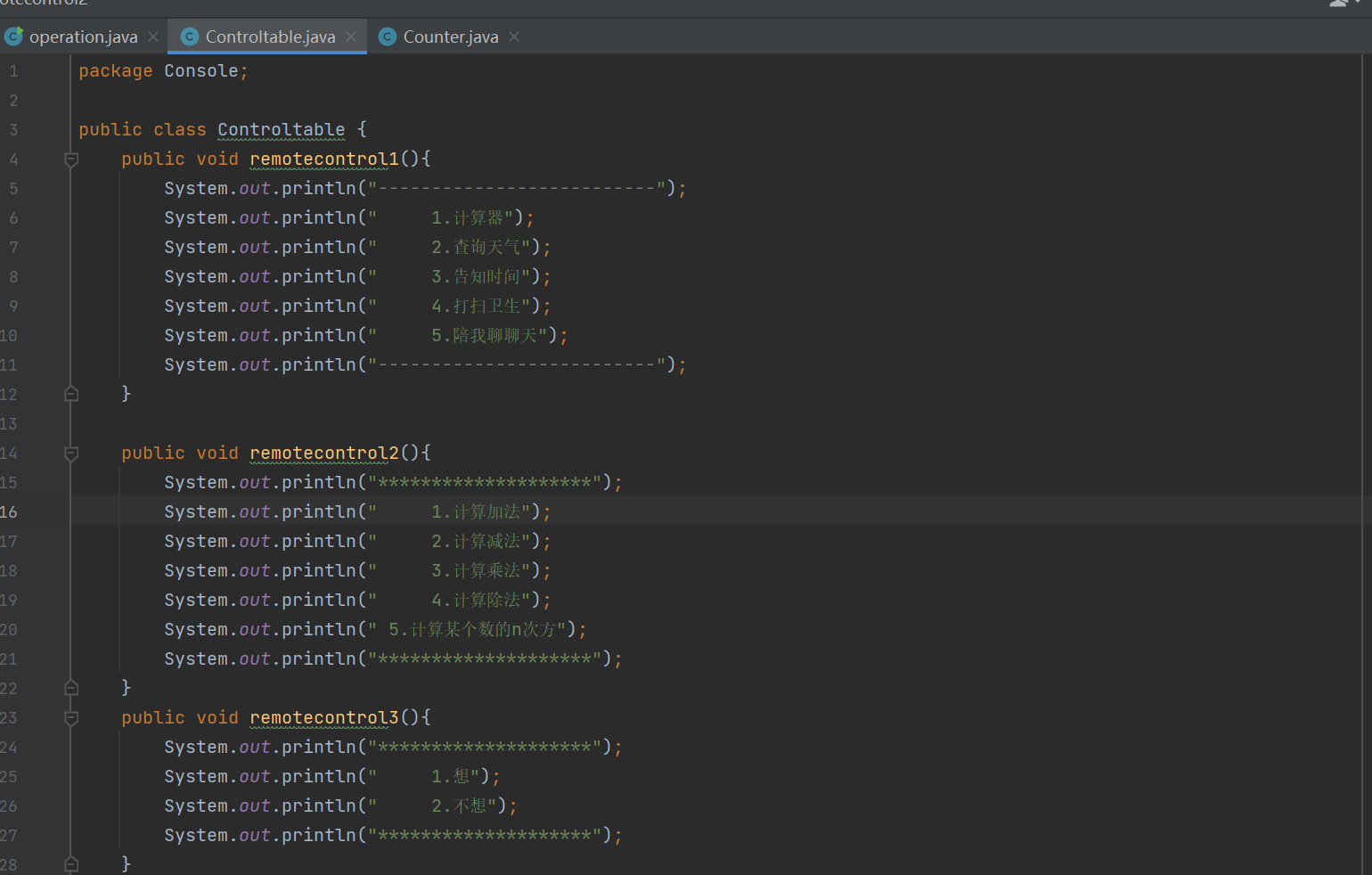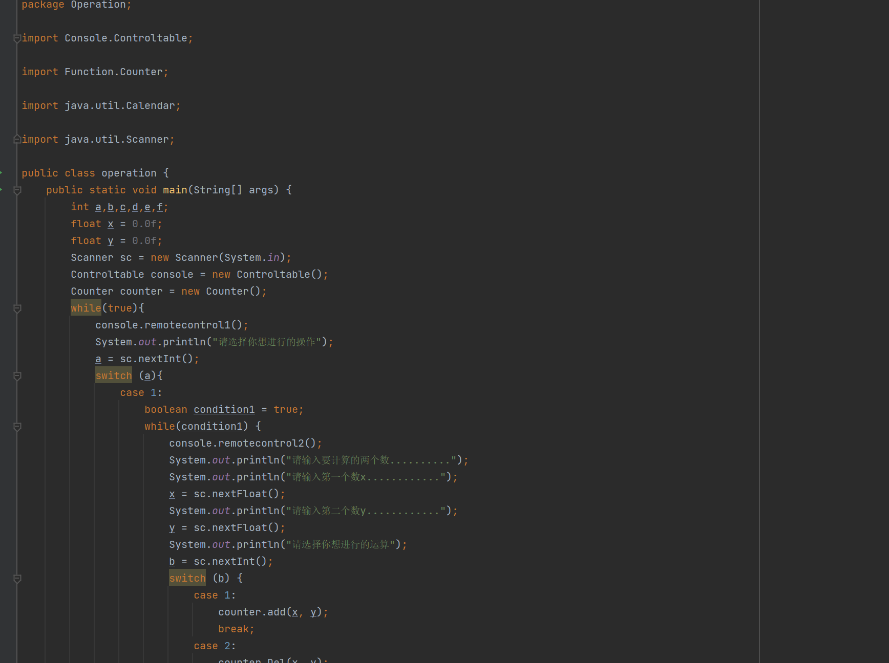通过boolean函数设置一个变量为0,,然后运用简单的swtich语句实现选择结构,再在程序尾端设置一个是否继续操作的界面,可以将前面的变量附为0(不循环)或1(循环)