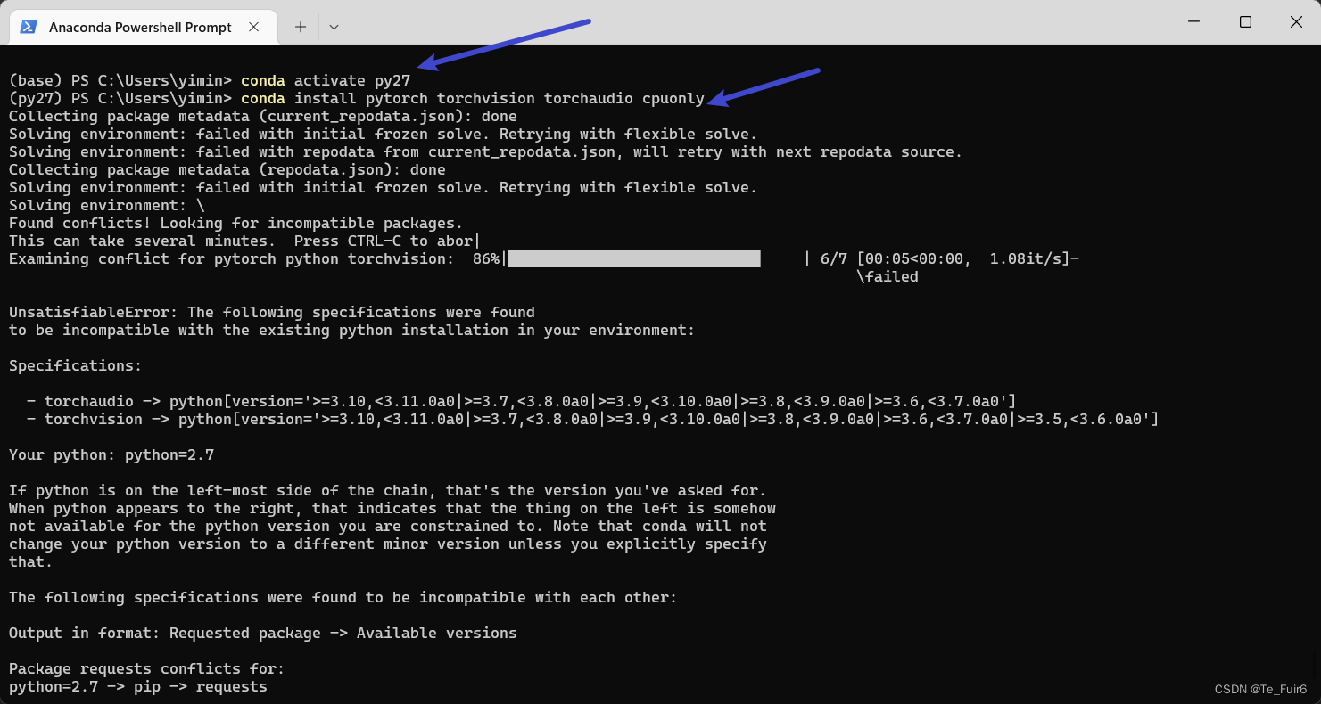 在这里说一下解决方案:建议使用指令conda activate base 回退到base环境,重新安装