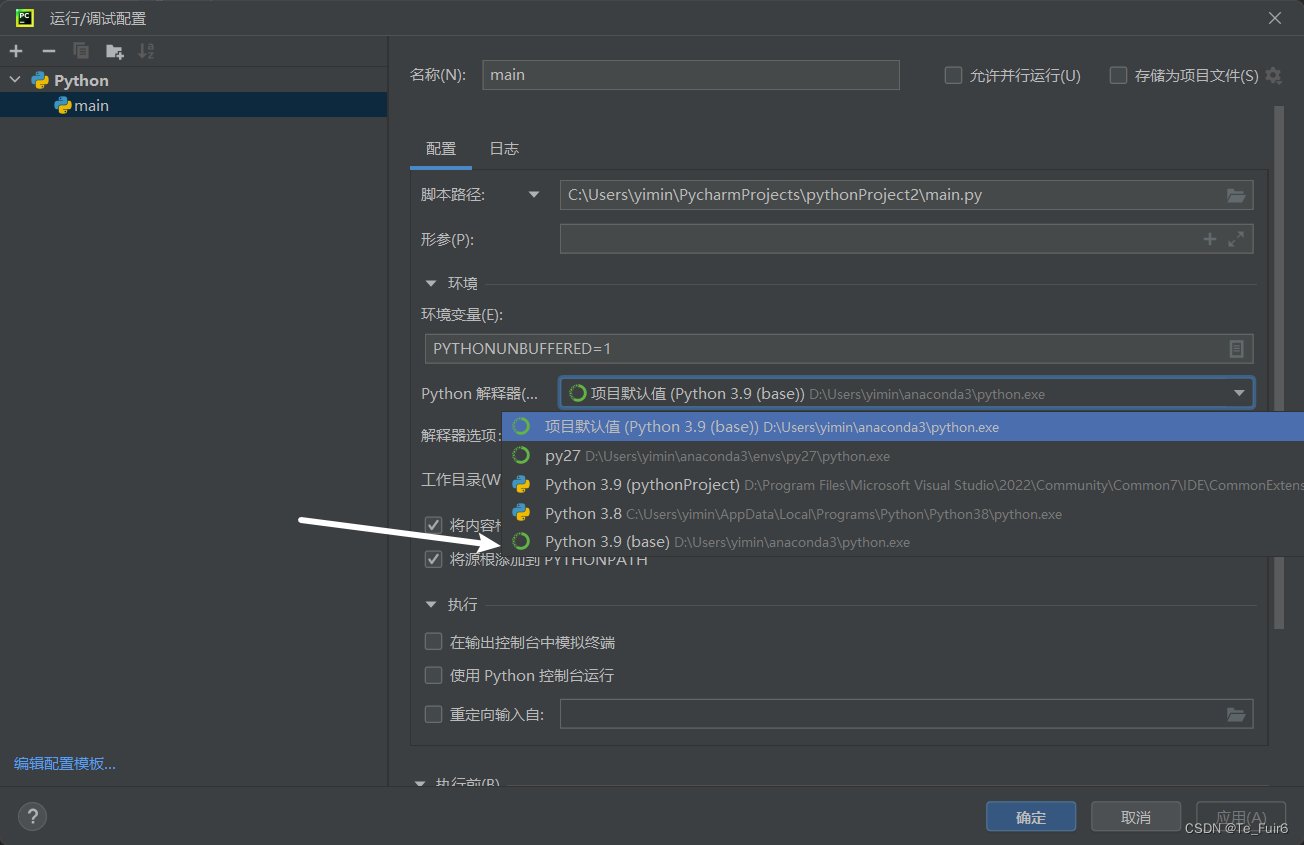 记住我们所需要的解释器的路径,在编辑配置中,要选择与你刚刚的环境路径一致的解释器,如果在这解释器列表里找不到正确的解释器,进入:文件--设置(或者Ctrl+Alt+S打开Setting)--python解释器--添加解释器,安装对应的目录添加