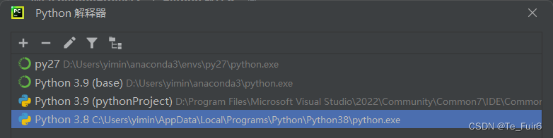 在配置环境的时候,你可以把他当作python,甚至可以用它来取代原来的python ,正如下图所示,在安装了Anaconda后,你既可以选择电脑中原有的Anaconda作为项目的解释器,也可以选用anaconda作为你项目的解释器
