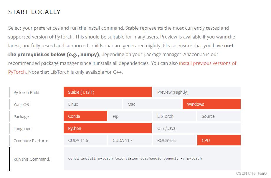 版本选择教程很多(主要就是搞清楚选择哪个compute platform),大家可以自行查阅,在这里只说一点: