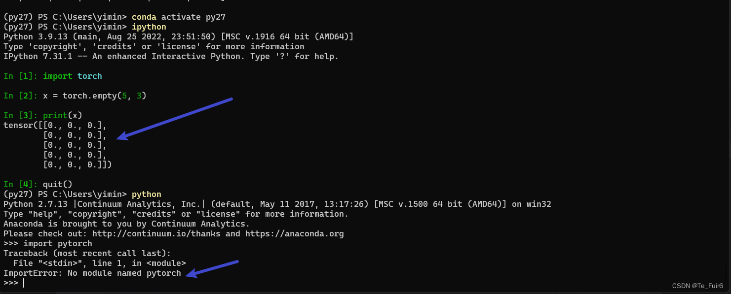 这是噩梦的开始……………………………………(我在这个python2.7的环境中累死累活装了一晚上的pytorch,装失败而不自知,可能是装了一部分,但是没有完全成功,导致我在ipython中能自娱自乐的输入测试,但是在python和pycharm中却不能使用,如果仔细观察上面的安装流程会发现,其实在安装过程中就已经报了很多的错,只是被我忽略了而已……)
