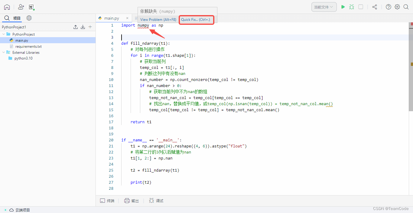 与平时编写代码一样,在 Lightly 中调用第三方库需要使用 import 函数。使用传统的编辑器运行 GUI 需要配置环境,再安装相应的第三方 GUI 库。Lightly 则借助自动检测及配置环境的优势,省去了配置环境的繁琐工作,同时通过 Quick Fix 一键安装所需的依赖。