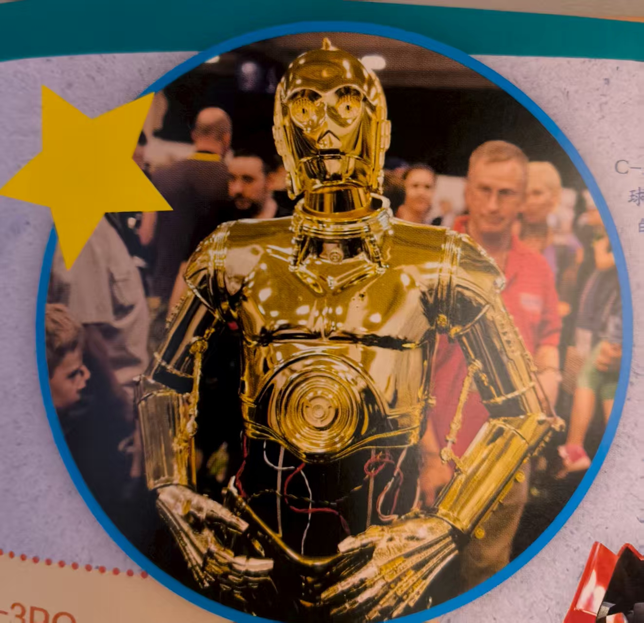 C-3PO机器人:外文名See-Threepio,是由沙漠行星塔图因上一个九岁的天才安纳金·天行者(为帮助母亲西米)用废弃零件和回收物拼凑而成的神经质、多愁善感型礼仪机器人,初始高度167厘米且无外壳覆盖内部线路,后由其母亲安装防护外壳 。该机器人具备多语言处理能力,可识别超过30000个物种语言并使用600万种沟通方式进行礼仪辅导与翻译
