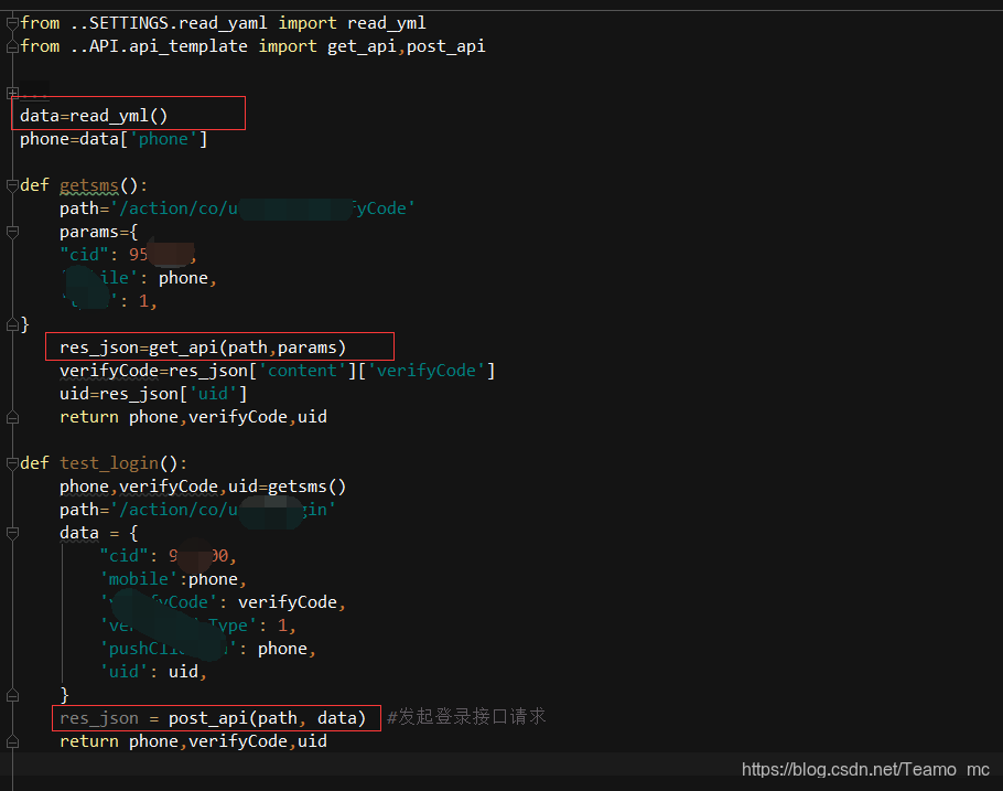 获取验证码和进行登录时,直接调用已封装好的读取yaml内的函数、post请求函数、get请求函数。