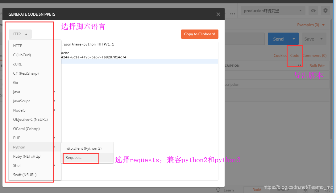 3.导出脚本:将postman的脚本转化成对应的python脚本