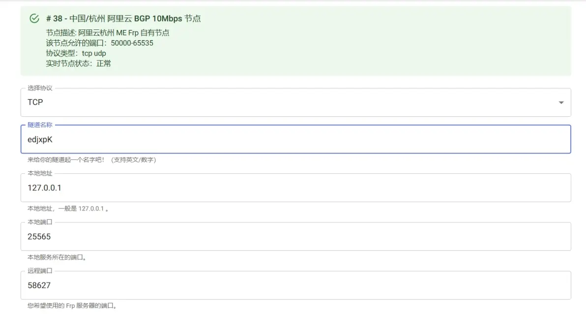 接着来到“创建隧道”(mefrp.com/console/tunnel/create),先选择节点(离你那里越近越好),这里我选择中国/杭州 阿里云 BGP 10Mbps 节点。接着选择协议,Minecraft Java使用的是TCP协议,所以选择TCP;隧道名称自行填写;本地地址默认127.0.0.1,本地端口如果未作任何设置就是25565;远程端口默认即可。完成后,点击创建隧道即可完成创建。