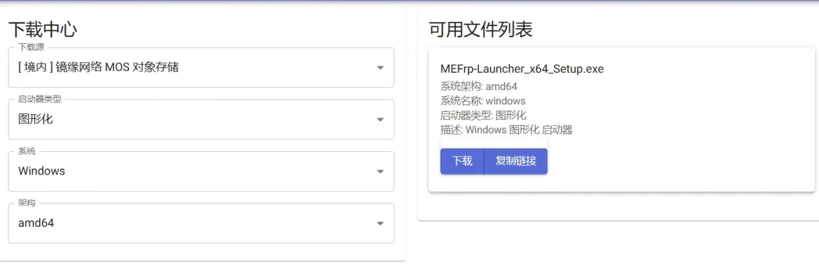 创建好隧道,来到文件下载(mefrp.com/download),按照以下信息选择并下载安装包