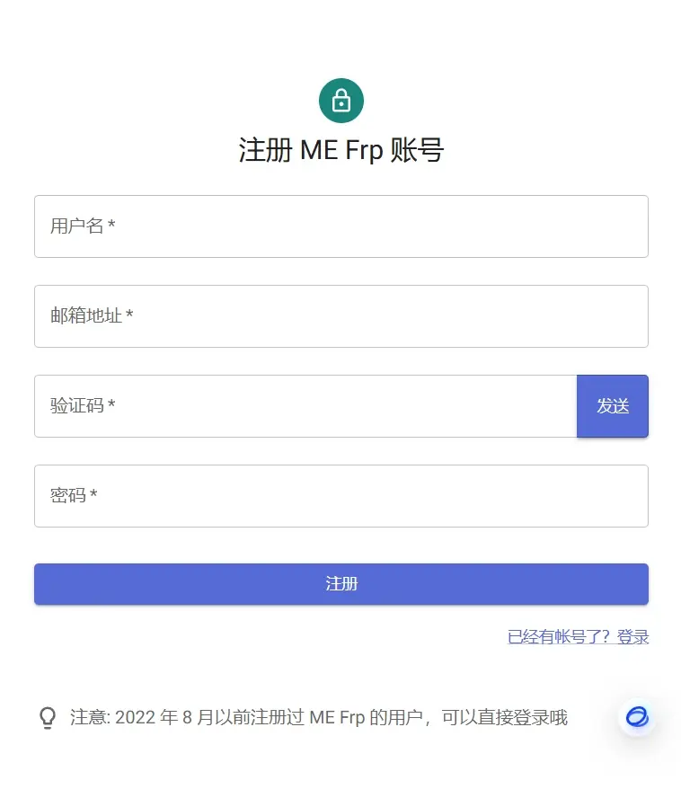 首先,来到mefrp的官网(mefrp.com),点击“开始使用”,进入登录页;再点击右下角的注册,来到注册页。