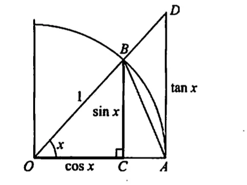 我们假设夹角∠AOB=x\angle AOB=x∠AOB=x,这里采用弧度制。我们令圆心OB的长度等于1,那么BC=sinxBC=\sin xBC=sinx,OC=cosxOC=\cos xOC=cosx,AD=tanxAD=\tan xAD=tanx。我们下面要用这张图里的几何图形的面积关系,显然: