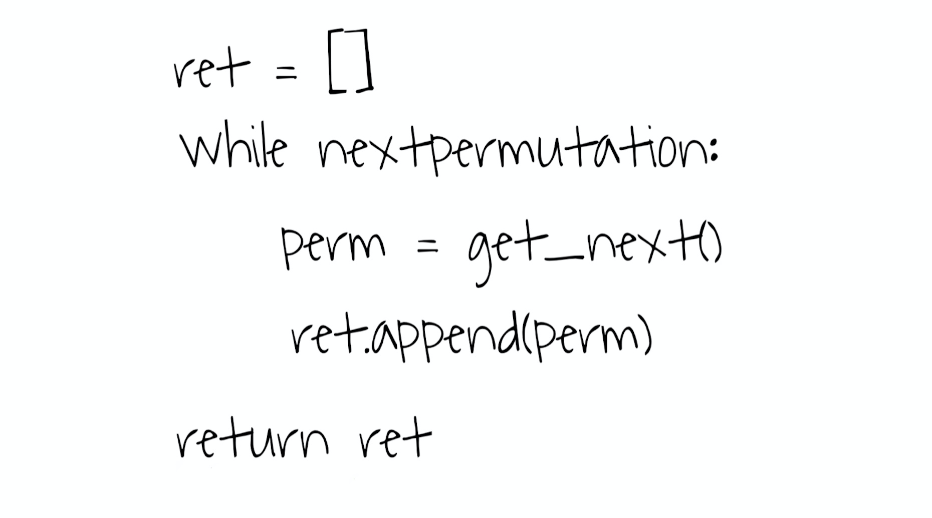 本质上我们是从最小的排列开始,不停地用一个叫做get_next的方法获取比当前序列大的下一个序列,当没有更大的序列的时候,说明我们已经获得了所有的排列,那么直接返回结果即可。如果忽略get_next当中的逻辑,这个代码其实只有几行:
