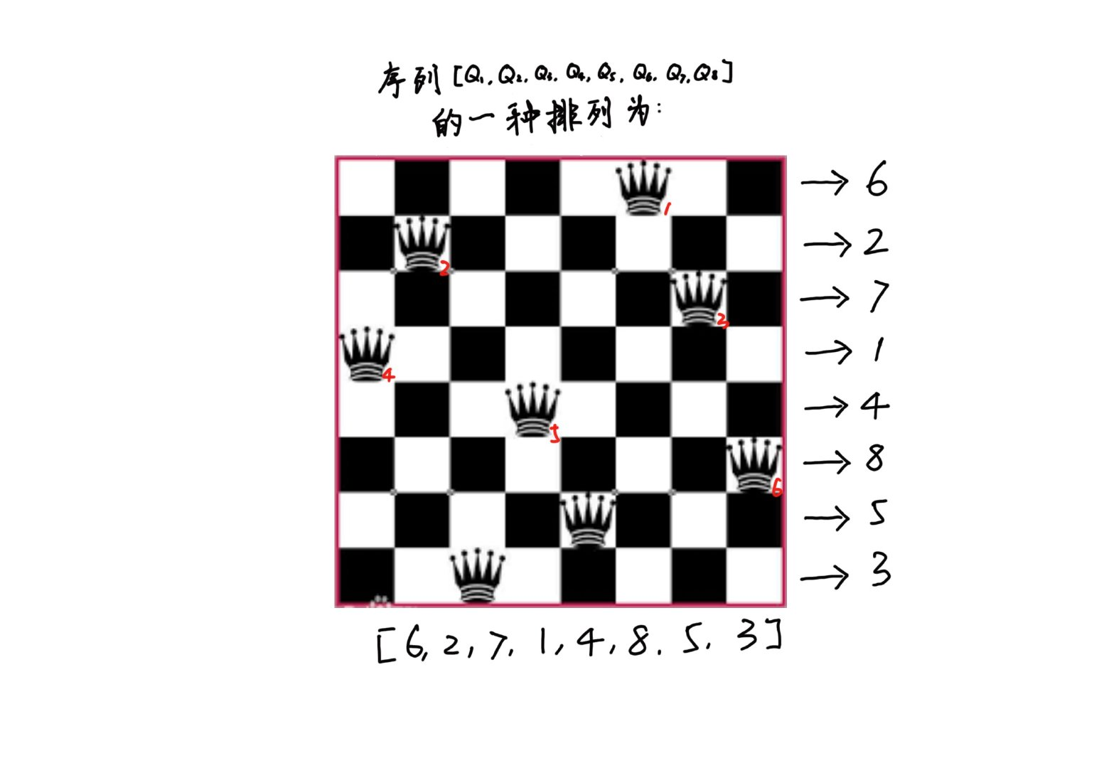 如果还不理解,可以参考一下下图,我们给皇后编号,把皇后同样看成是序列当中的元素,那么八皇后的摆放位置刚好可以映射成一种排列。映射的方式非常简单,就是我们忽略行的信息,依次记录下皇后摆放的列号。