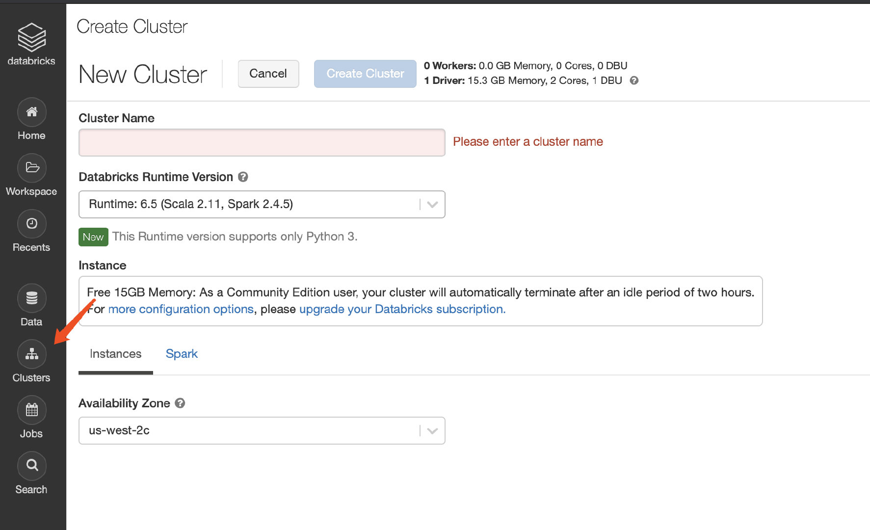 注册好了之后,我们就可以进行愉快地使用了。首先我们创建一个新的集群,点击菜单栏左侧的clusters然后选择一下spark的版本填一下集群的名称即可。