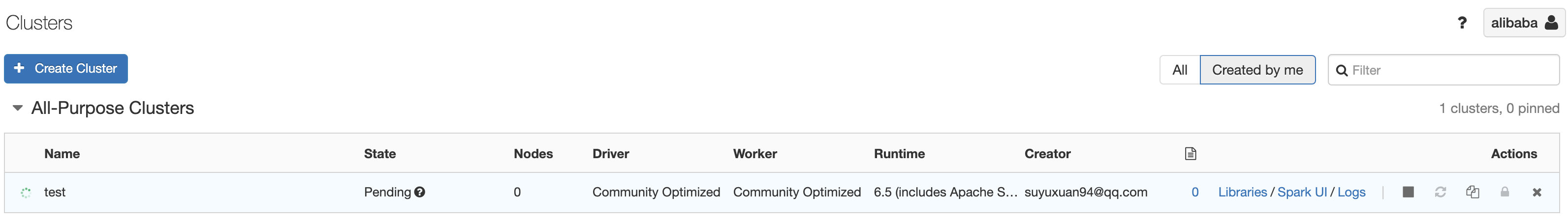 spark的版本可以不用更改,填好名字之后点击create cluster即可。系统有一点点慢,稍微等一会再刷新就会发现列表当中多了一个集群。集群的启动需要一点时间,我们耐心等待即可。