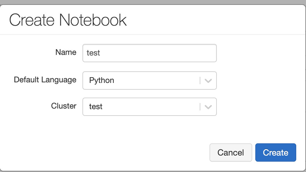 接着会有一个弹框让我们选择语言和集群,这里的语言我们选Python,如果你喜欢也可以换成Scala。集群就选择我们刚才创建的test集群。