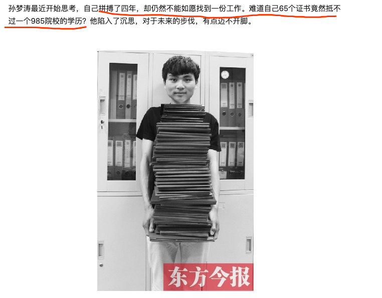 如果你看过他列出来的65封荣誉证书,再对比一下刚才说到的相关性,答案就不言自明了。其中大量的证书都是和专业不相关的荣誉证书,还有一些像是创业大赛、摄影大赛的获奖经历。这些证书和985的文凭孰轻孰重,我想应该也不用我多说了。