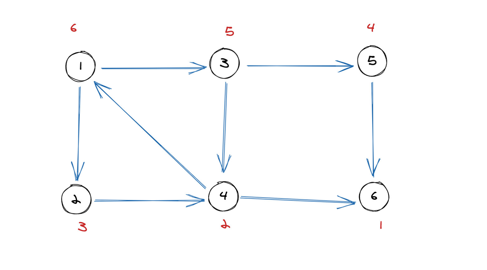 反向图也很好理解,由于我们求解的范围是有向图,如果原图当中存在一条边从u指向v,那么反向图当中就会有一条边从v指向u。也就是把所有的边都调转反向。
