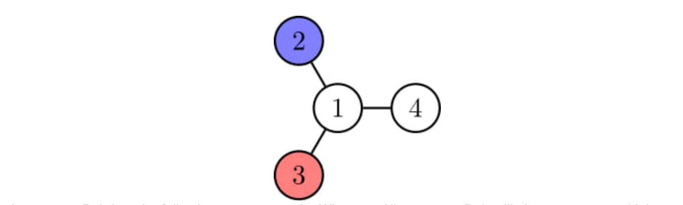 蓝色表示Alice,红色是Bob。由于Alice先手,只要Alice移动到1节点,无论Bob如何移动,他都必输无疑。