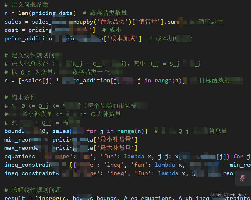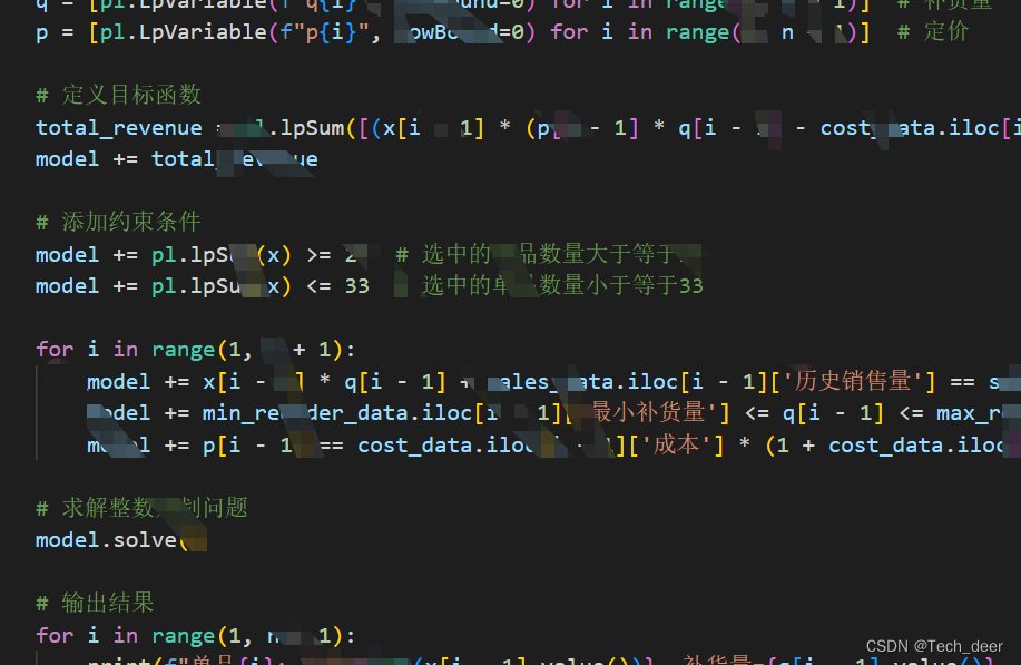 - 定价策略的约束条件(例如,成本加成定价策略):pi=成本⋅(1+加成比例)pi=成本⋅(1+加成比例)(对于每个单品 i)