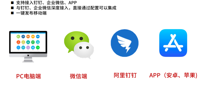 MyApps平台拥有丰富API接口功能,通过这些接口平台可以快速的同其他系统进行整合,实现系统间业务数据的双向交换、业务处理流程等功能。解决企业系统间信息孤岛的问题。同时MyApps平台还是支持一端配置多端同步生产,一键配置结课链接到企业微信以及钉钉当中,往后各种变更无需进行二次开发,即可轻松实现移动办公的全面化;