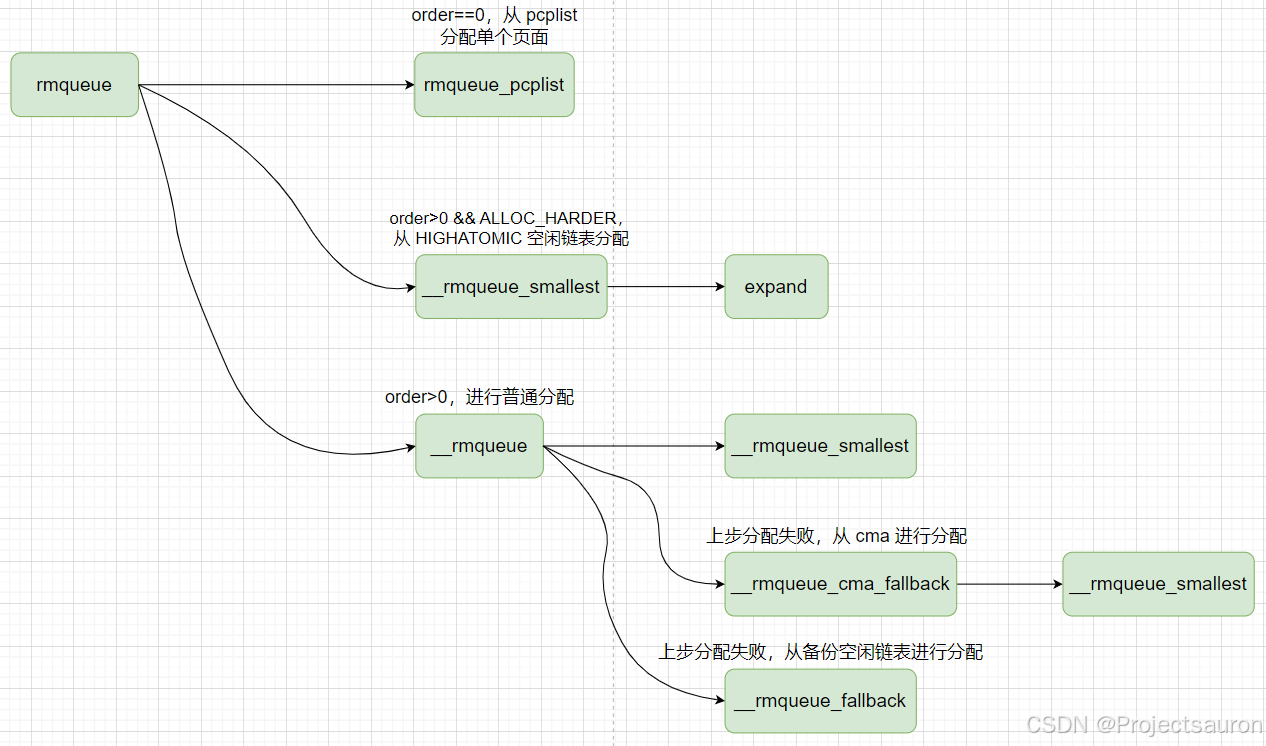 rmqueue() 函数用来在管理区中找到一个空闲块。如果页框被成功分配,rmqueue() 函数就返回第一个被分配页框的页描述符。否则,函数返回 NULL。