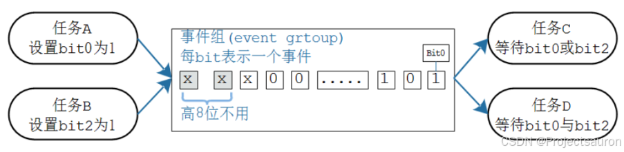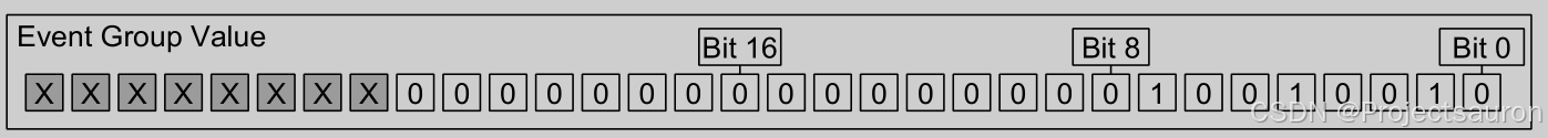 - 每一位事件的含义由程序员决定,比如:Bit0 表示用来串口是否就绪,Bit1 表示按键是否被按下。这些位,值为 1 表示事件发生了,值为 0 表示事件没发生