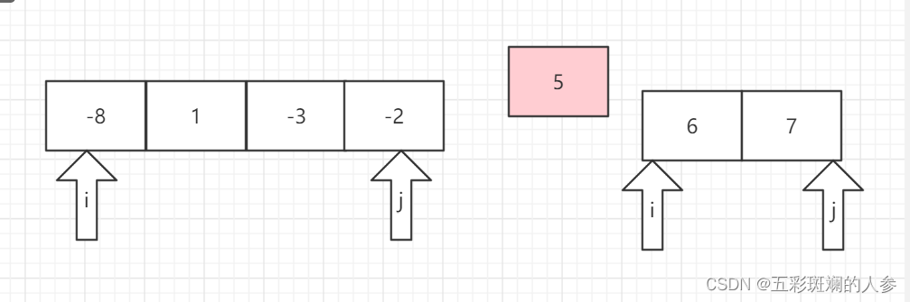 第一轮完成,基准数左边都比基准数小,右边都比它大,例如此时,第一轮结束后5的左边都比5小,右边都比5大(一组有正数和负数所组成的无序数据,用最快的方式让正数在前,负数在后,只需要一轮的快排就行)