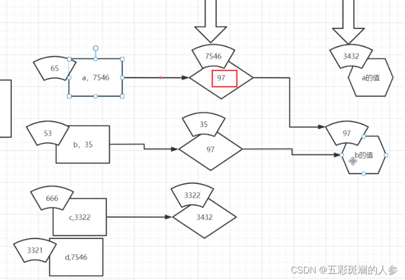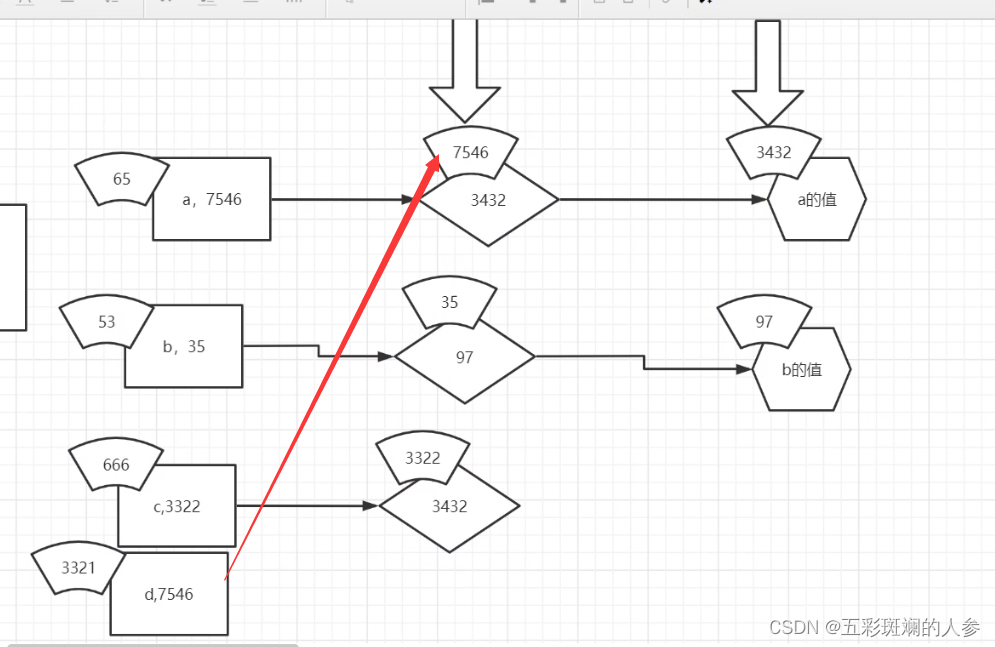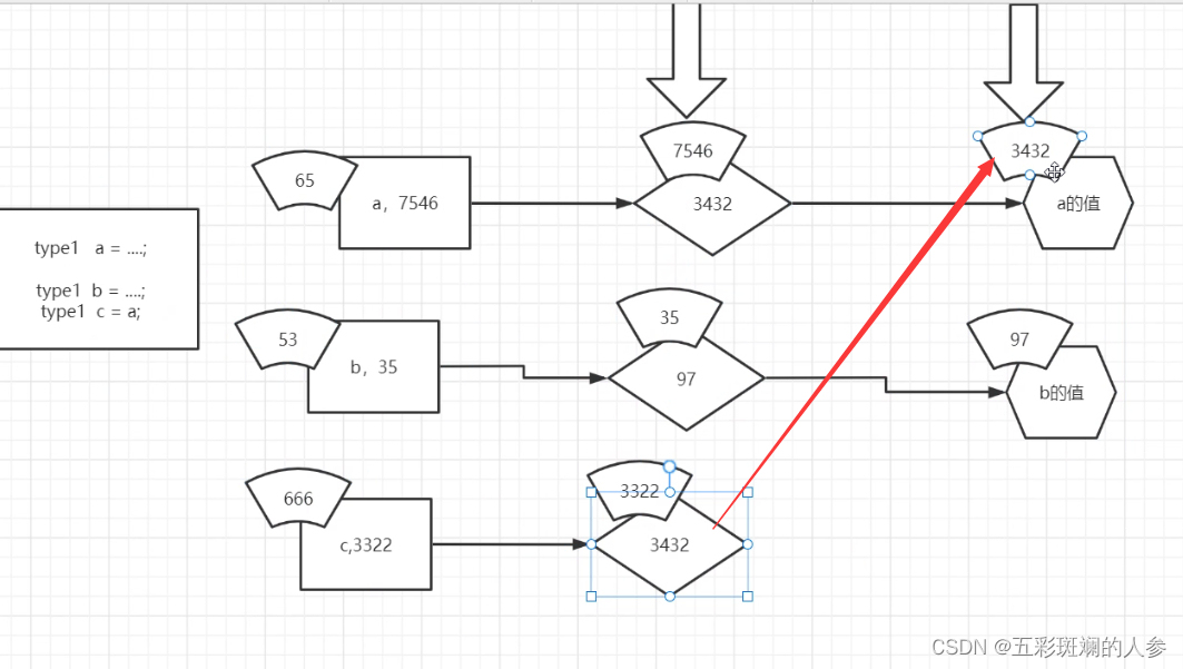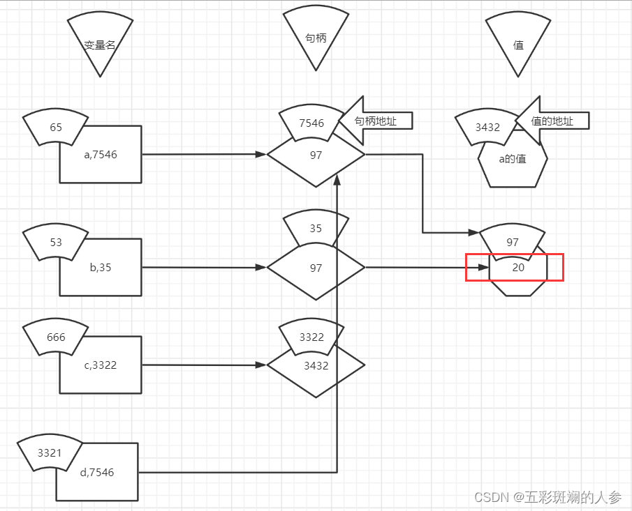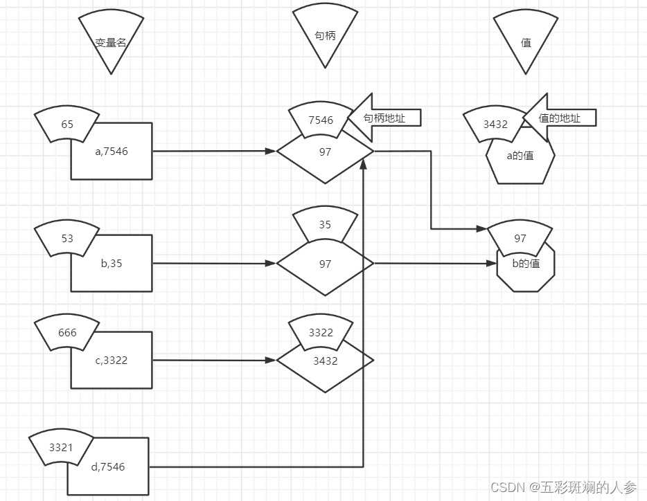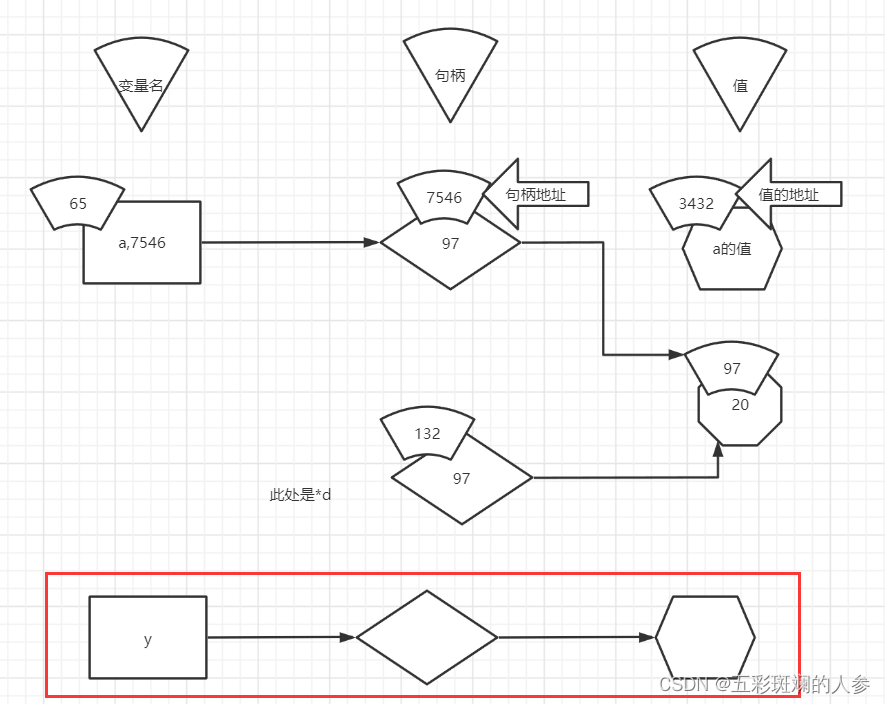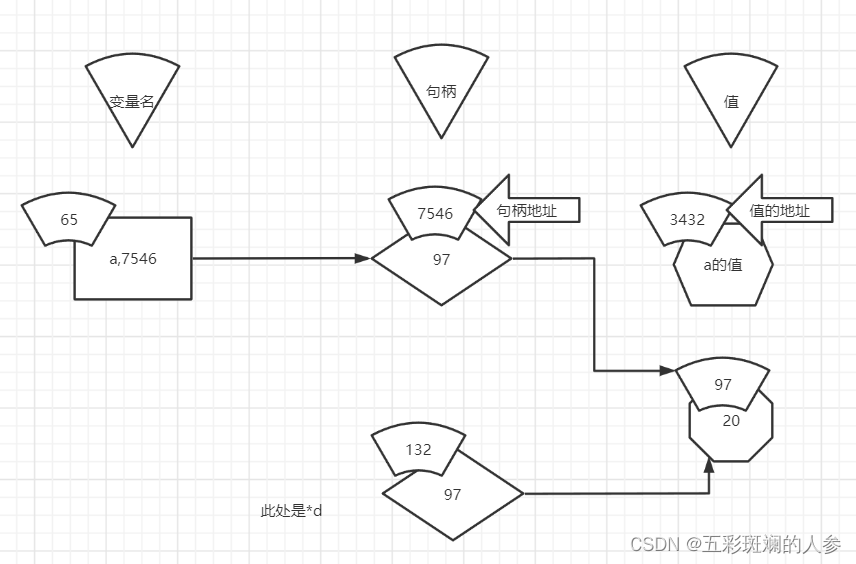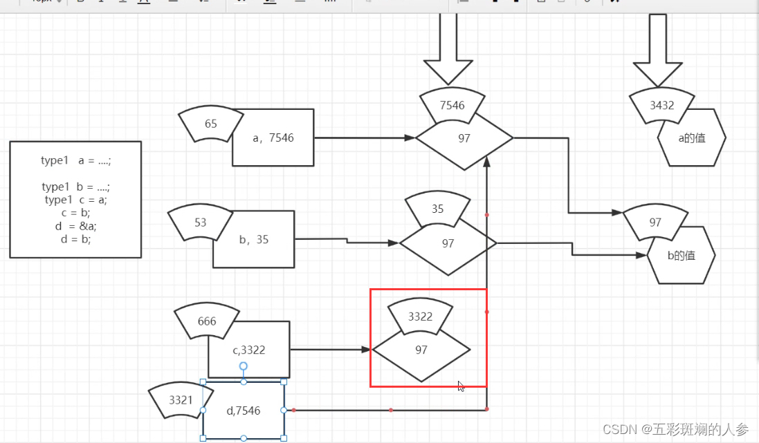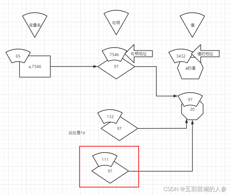 实际上*d占空间时没有3221(变量名)这块,只有7546这块,是*d,复制出来一个a的句柄,存的是值的地址,即指向97,整个变量赋值只有两个部分(7546+97)