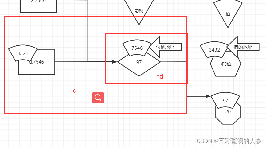 int *d=&a; //拿的是a的句柄地址,&a就是a的句柄,*d代表的是句柄,d代表的是3321这块+7546这块。*d只有7546这块