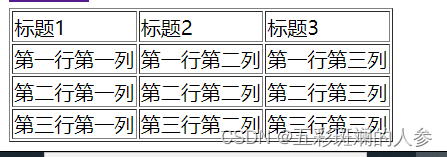 <table> <thead> <tr> <td>标题1</td> <td>标题2</td> <td>标题3</td> </tr> </thead> <tbody> <tr> <td>第一行第一列</td> <td>第一行第二列</td> <td>第一行第三列</td> </tr> <tr> <td>第二行第一列</td> <td>第二行第二列</td> <td>第二行第三列</td> </tr> <tr> <td>第三行第一列</td> <td>第三行第二列</td> <td>第三行第三列</td> </tr> </tbody> </table>效果如图。