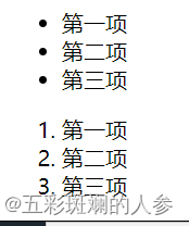 <ul> <li>第一项</li> <li>第二项</li> <li>第三项</li> </ul> <ol> <li>第一项</li> <li>第二项</li> <li>第三项</li> </ol>效果如图。