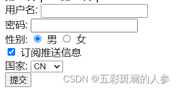 <form action="/" method="post"> <!-- 文本输入框 --> <label for="name">用户名:</label> <input type="text" id="name" name="name" required> <br> <!-- 密码输入框 --> <label for="password">密码:</label> <input type="password" id="password" name="password" required> <br> <!-- 单选按钮 --> <label>性别:</label> <input type="radio" id="male" name="gender" value="male" checked> <label for="male">男</label> <input type="radio" id="female" name="gender" value="female"> <label for="female">女</label> <br> <!-- 复选框 --> <input type="checkbox" id="subscribe" name="subscribe" checked> <label for="subscribe">订阅推送信息</label> <br> <!-- 下拉列表 --> <label for="country">国家:</label> <select id="country" name="country"> <option value="cn">CN</option> <option value="usa">USA</option> <option value="uk">UK</option> </select> <br> <!-- 提交按钮 --> <input type="submit" value="提交"> </form>效果如图。