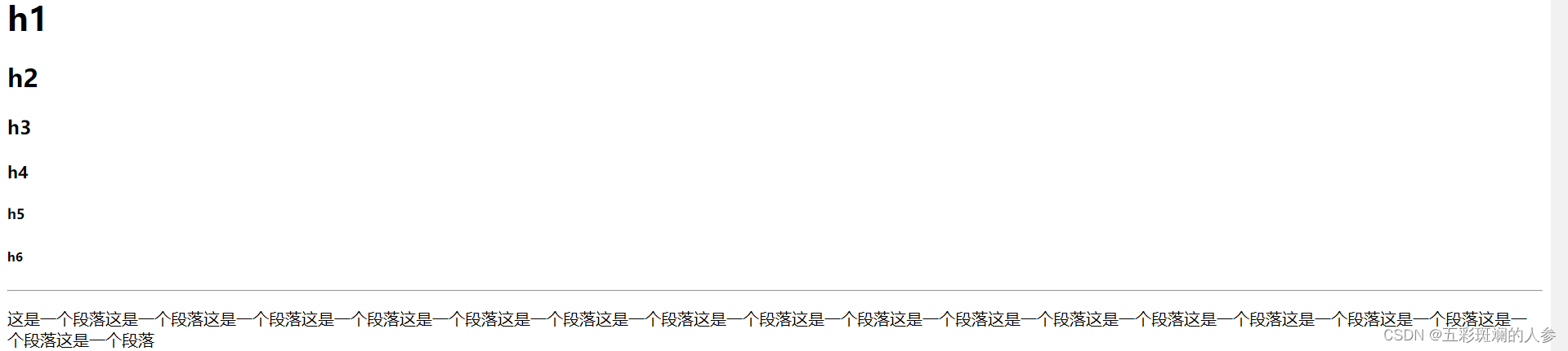 <h1>h1</h1> <h2>h2</h2> <h3>h3</h3> <h4>h4</h4> <h5>h5</h5> <h6>h6</h6> <hr> <p>这是一个段落这是一个段落这是一个段落这是一个段落这是一个段落这是一个段落这是一个段落这是一个段落这是一个段落这是一个段落这是一个段落这是一个段落这是一个段落这是一个段落这是一个段落这是一个段落这是一个段落</p>效果如图。
