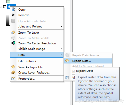 3、对第二个数据图层右击,Date——Export Date,在对话框设置相关参数,选择the Data Frame(当前工作区的坐标系统),此时坐标系已经改成Krasovsky_1940_Albers,save输出新的图层即可;