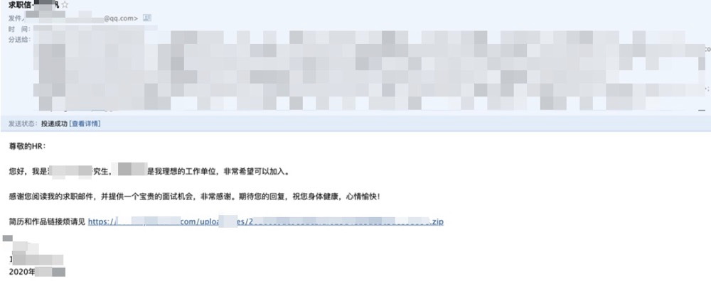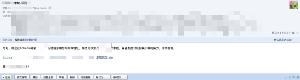 4、简历拥有分发属性。我们在多次钓鱼项目中发现,当你投递的简历到非对应项目人的邮箱里时,他会帮你转发,甚至有些热心的HR还会帮你录入到内部人才库,这相当于一下子从不可信变成内部可信了,这也是简历投递钓鱼有意思的地方。