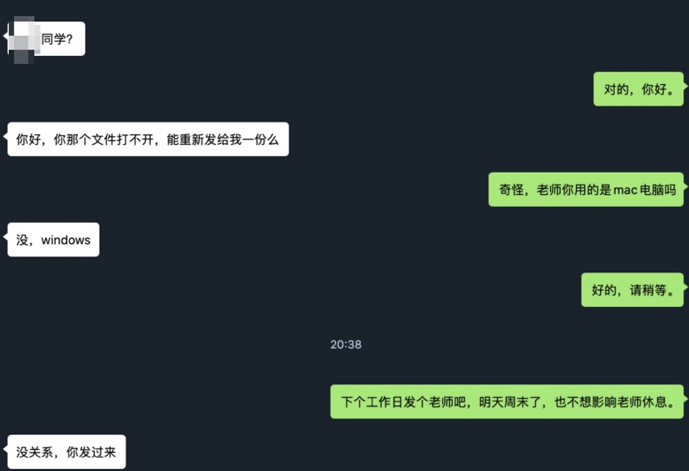 下⾯的图⽚展示了当与受害者“交流沟通”⼀段时间后,已经完全“掌控”了对⽅,甚⾄对⽅在周末问我要简历时,为了防⽌客户机周末不间断的关机休眠,特地美名其⽈的说不想打扰到对⽅,等到⼯作⽇再投递相关“⽊⻢”: