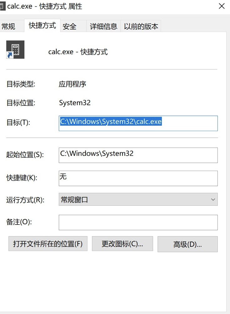 下图为calc.exe的快捷⽅式的属性信息,我们可以在“⽬标”栏写⼊⾃⼰的恶意命令,如powershell上线命令:
