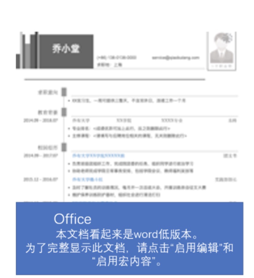 我们可以尝试使⽤如下⼿段,背景为⼀个虚化的简历图⽚,然后在上⽅再加上⼀段⽂字,意思告诉受害者,这是⼀份简历,但是因为你没点击宏运⾏,所以看不清,要想看清,请点击运⾏宏: